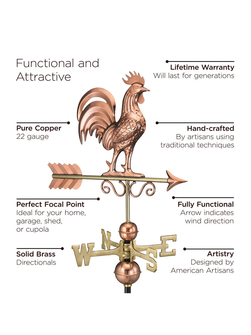 Crafted with an intricate attention to detail, these Bantam Rooster Weathervanes hearkens back to a simpler time. For over 35 years Good Directions Pure Copper Weathervanes have been unsurpassed in style, quality, and durability ā perfect for the house-proud homeowner. Bring the Joy of Outdoor Livingā to your home with this heirloom-quality piece. Does not include a roof mount. The pure copper will age naturally over time.