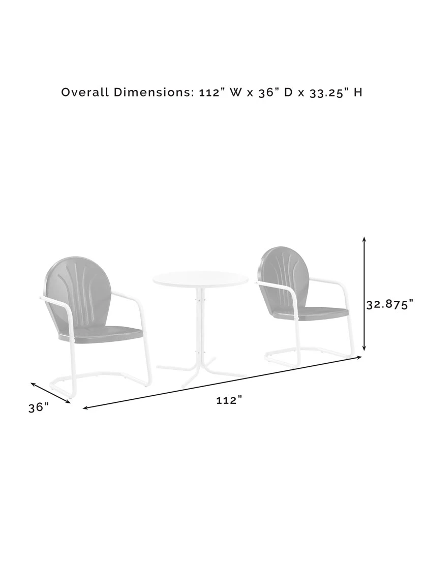 Add retro simplicity and function to your outdoor retreat with the Griffith 3pc Bistro Set. Featuring a powder-coated finish over durable steel, the bistro table partners with two classic Griffith Chairs. Each chair has a vintage style that comes in a variety of vibrant colors and offers a cantilever base with just enough flex for lounging in comfort. The table has a sturdy pedestal base that easily tucks between the chairs, making the Griffith 3pc Bistro Set ideal for a small balcony or patio.