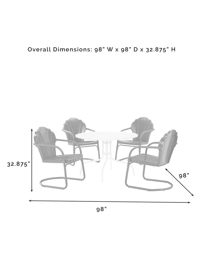 Charming and nostalgic, the Tulip 5-Piece Dining Set combines vintage style with classic function. Four scalloped chairs in vibrant colors surround a simple metal dining table for a fun and functional outdoor dining experience. The retro silhouette of each chair sits atop a cantilever base that provides a relaxed seat for dining al fresco.